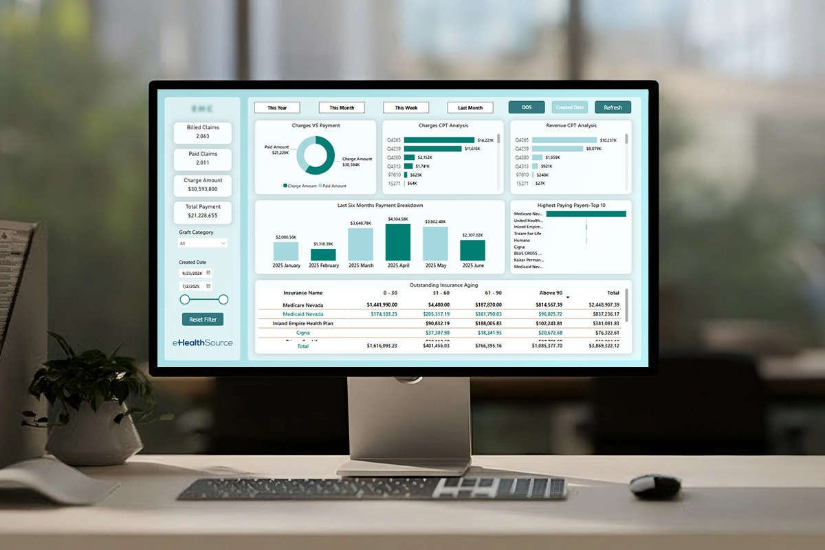 eHealthSource’s HIPAA-compliant analytics dashboards provide real-time insights into AR aging, denial rates, payer performance, and financial health. Track key performance indicators (KPIs) and make data-driven decisions that improve your practice’s operational efficiency and revenue cycle management.
